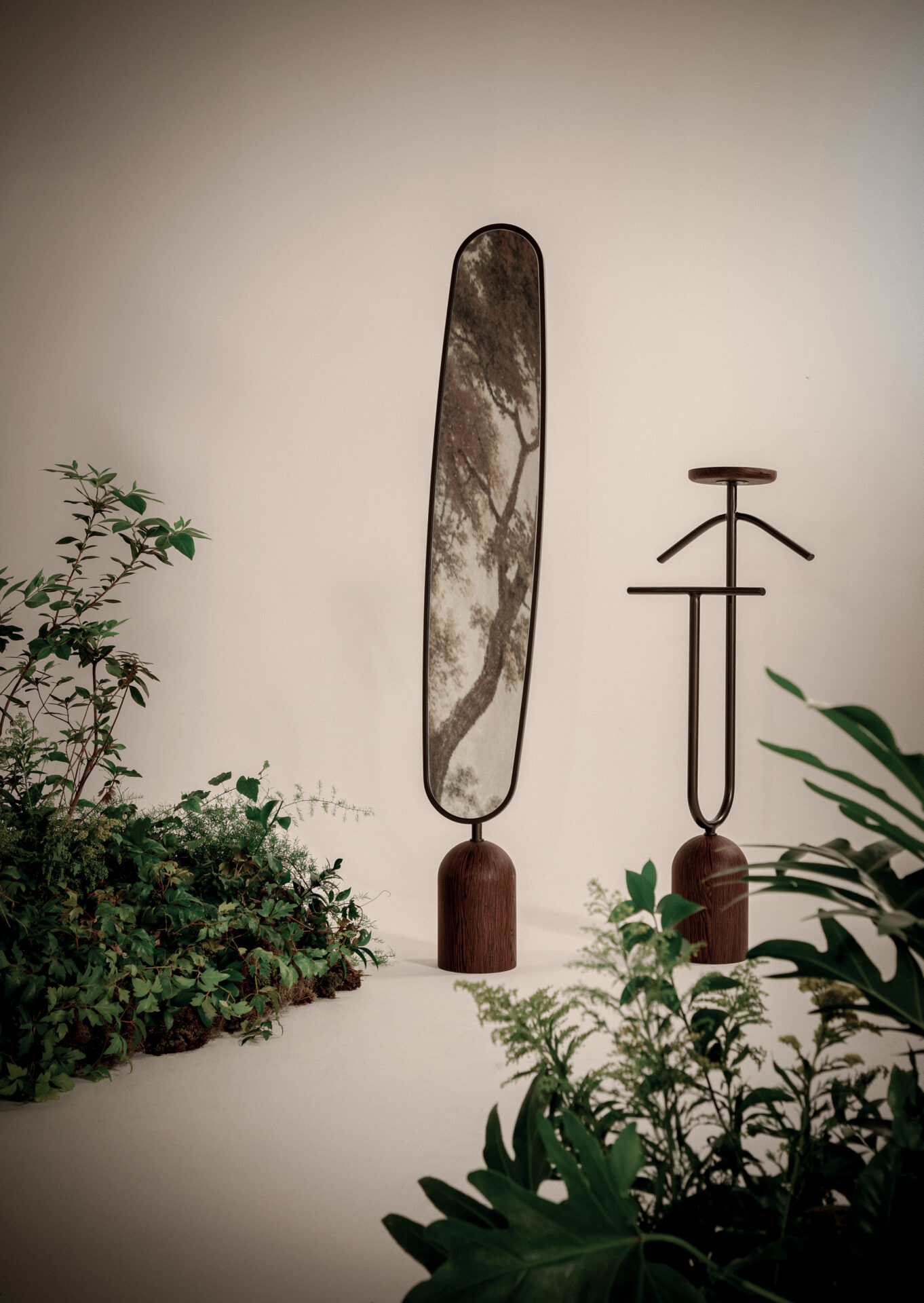 La línea Sammy está disponible en versiones de espejo de pie y perchero. Las piezas, construidas a partir de una imponente base de madera y estructuras metálicas, forman una composición que aporta toques de Art Déco mediante la valorización del objeto como escultura funcional y la elegancia de su silueta. En el espejo, la estructura metálica sostiene con ligereza una superficie ovalada, creando un contraste entre materiales.