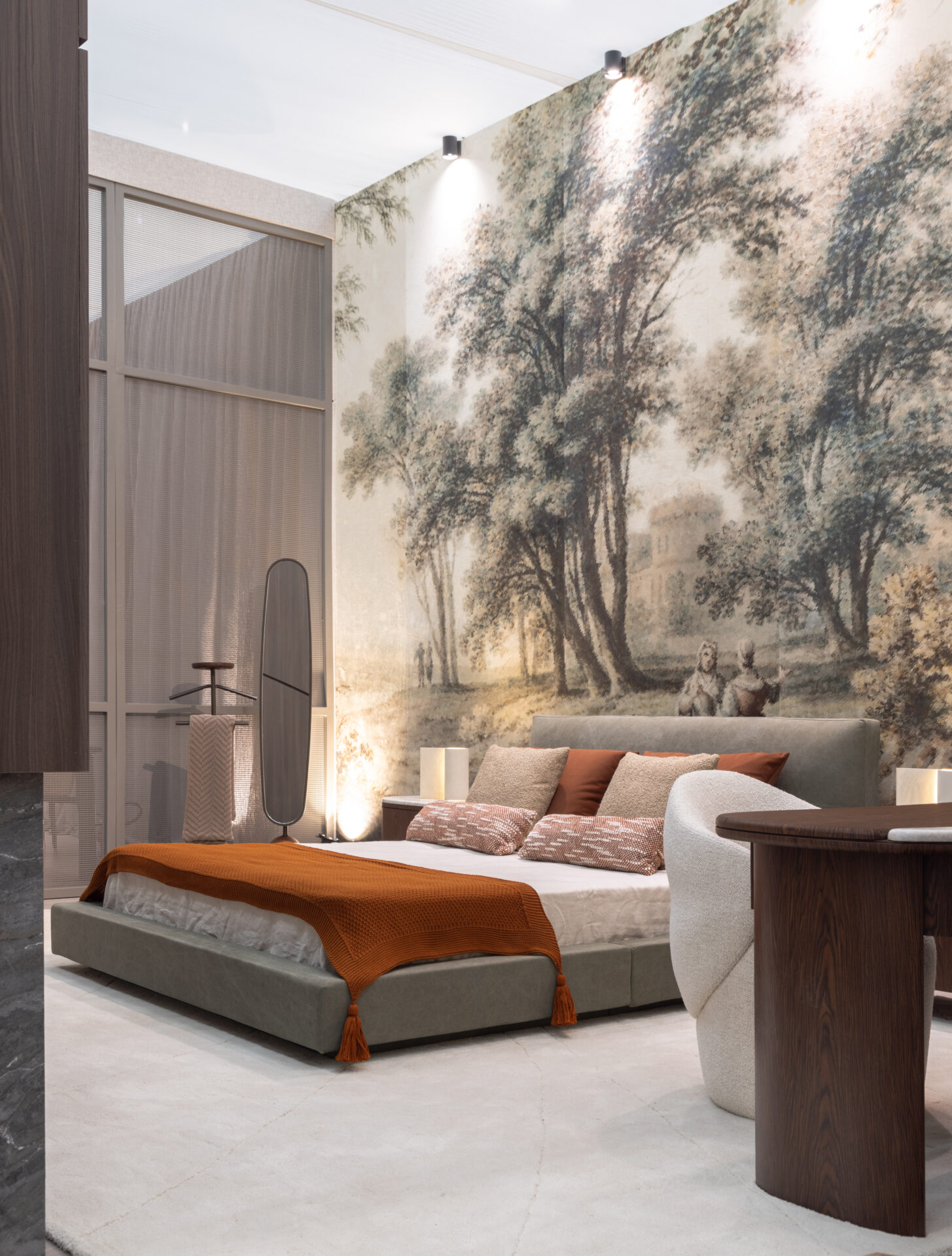 Los detalles de costura que recorren sus superficies, especialmente en el cabecero, refuerzan el trabajo artesanal, el valor de los materiales y la precisión técnica de la ejecución. El box dividido y flotante transmite ligereza al conjunto, y las diferentes opciones de tamaño de ala amplían aún más la pluralidad de ambientes a los que la cama se adapta.