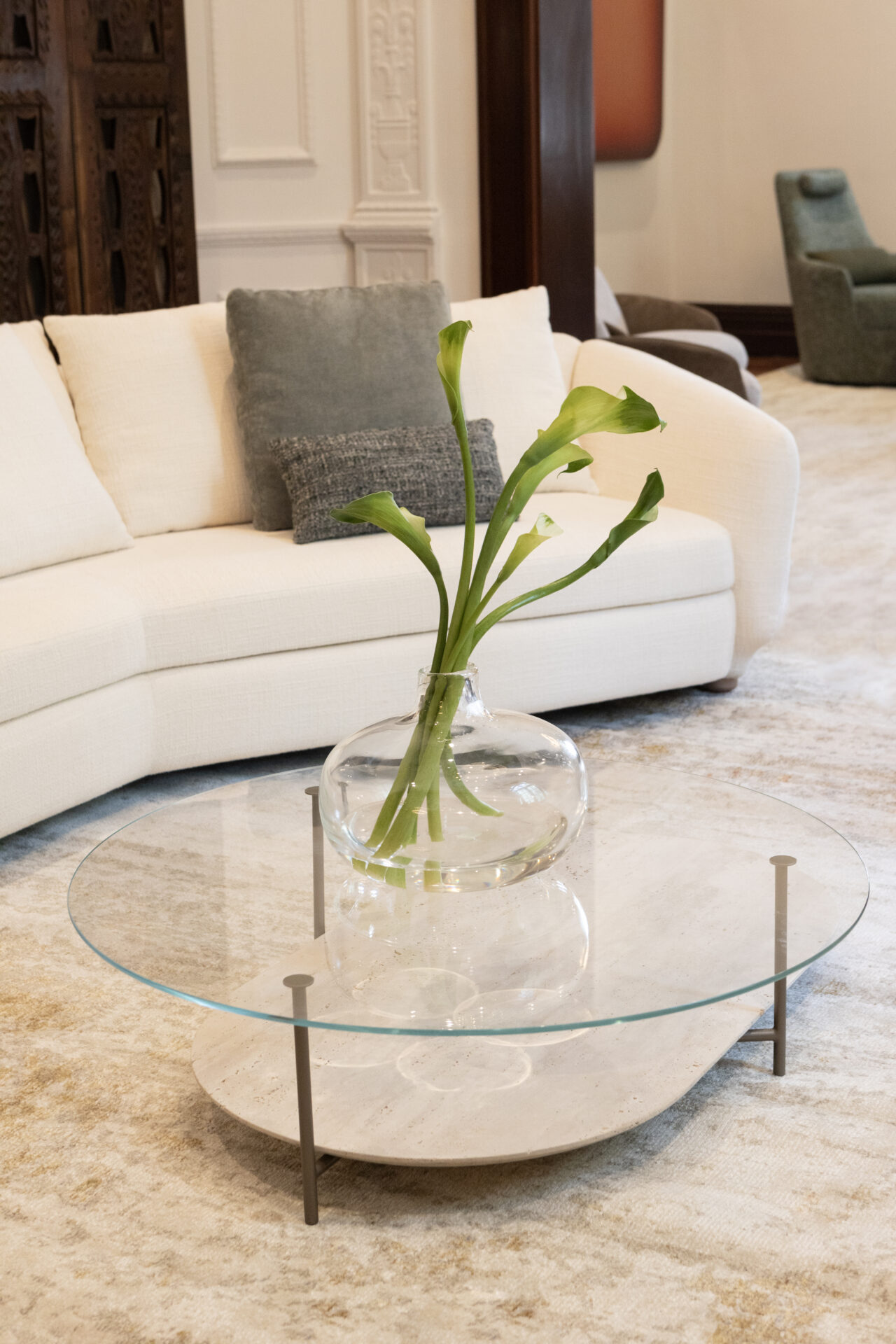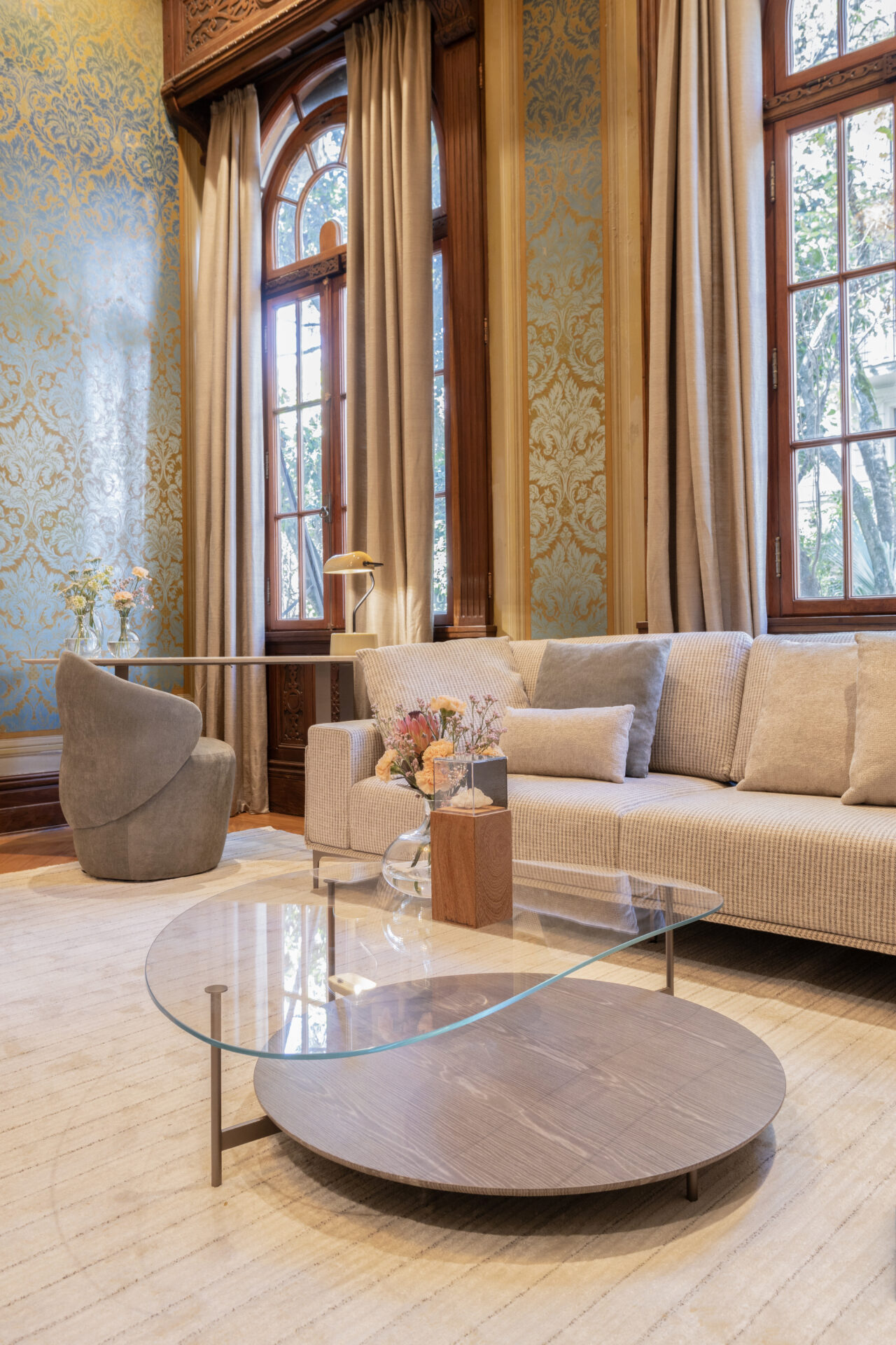 Essence é uma mesa de centro que desfruta de diferentes materiais e camadas para atingir composições singulares e criar uma verdadeira experiência sensorial. Nesta peça, um tampo inferior construído em madeira ou mármore fica sobreposto por um segundo tampo de diferente formato e em vidro, que permite a visualização. Os diferentes formatos e dimensões disponíveis possibilitam que a mesa Essence seja utilizada em conjuntos, organizados para conversar com cada ambiente de forma única.