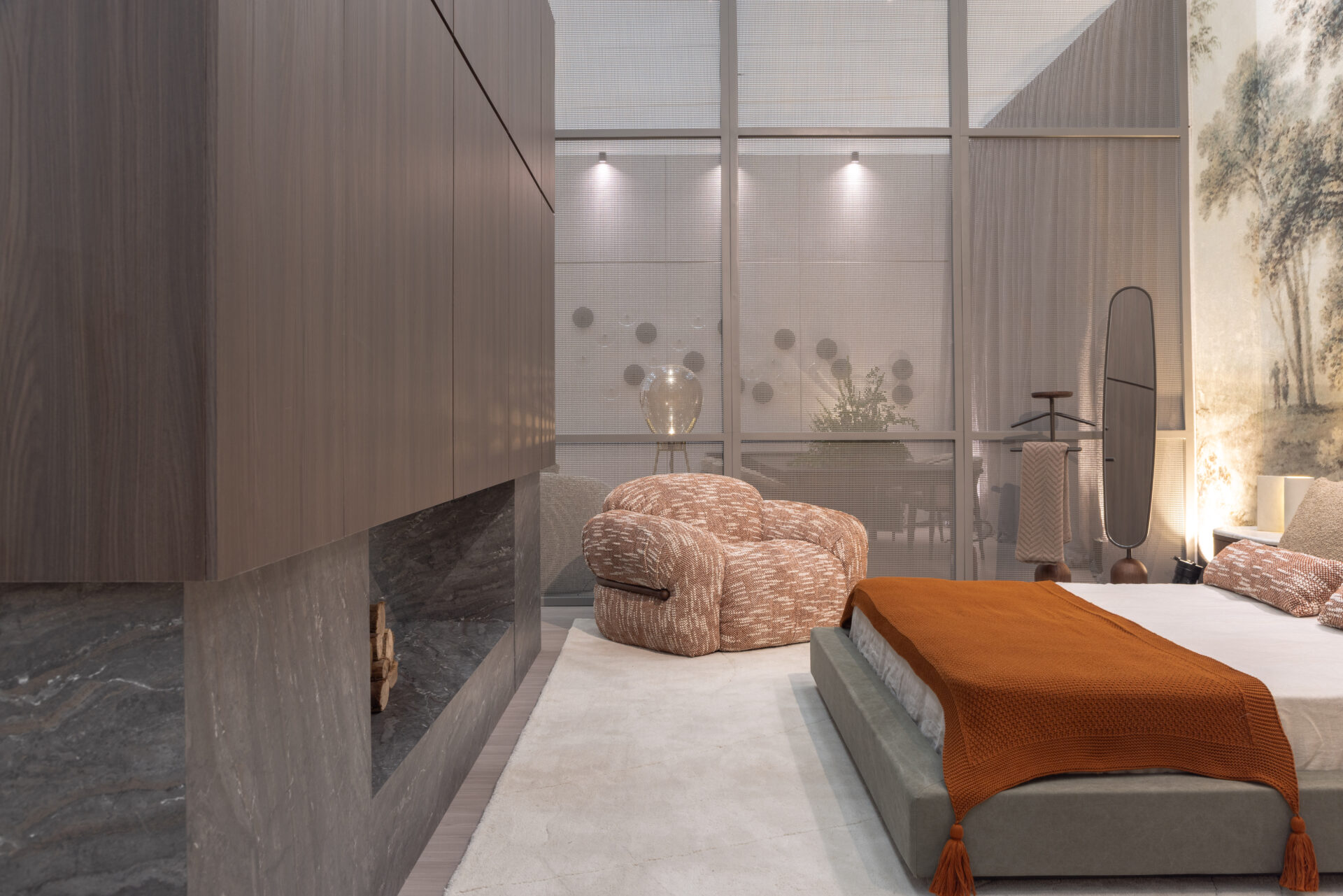 El gran destaque está en la estructura metálica que recorre los brazos y el respaldo, creando un contraste marcado entre la suavidad del tapizado y la rigidez del metal. Esta división visual no solo enmarca la pieza, sino que refuerza su identidad expresiva.